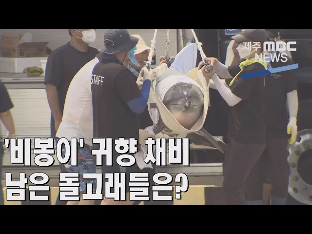 ◀ANC▶ 바다 방류가 결정된 남방큰돌고래 '비봉이'가 고향인 제주 바다로 돌아가기 위한 채비에 돌입했습니다. 바다에서 야생 적응 훈련을 시작했는데요, 하지만 아직도 국내 수족관에는 고래 21마리가 남아 있습니다. 이따끔 기자가 보도합니다. ◀END▶ ◀VCR▶ 수조 문이 열리자, 막으로 싸진 남방큰돌고래 '비봉이...