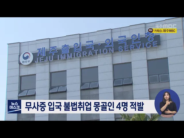 제주출입국외국인청은 도내 청소용역업체에서 일하던 불법 체류 몽골인 4명을 붙잡아 조사하고 있습니다. 이 가운데 2명은 2017년과 2018년 무사증으로 입국한 남매이며 나머지 2명은 이들 남매의 조카로 지난달 의료웰니스 단체관광객으로 입국한 뒤 친척을 찾아가 함께 일해온 것으로 드러났습니다.