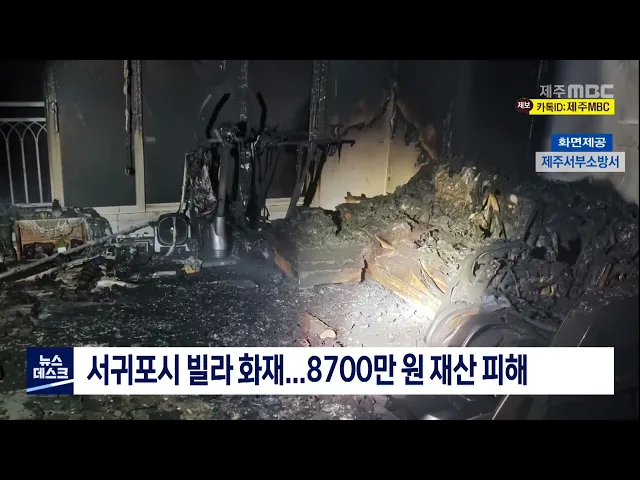 어젯밤 9시 반쯤 서귀포시 대정읍의 한 빌라 4층에서 불이 나 주민들이 대피하는 소동이 벌어졌지만 다행히 인명 피해는 발생하지 않았습니다. 이 불은 빌라 안에 있던 가구와 가전제품 등을 태워 소방서 추산 8천 700만 원의 재산피해를 냈습니다. 소방당국은 정확한 화재 원인을 조사하고 있습니다.