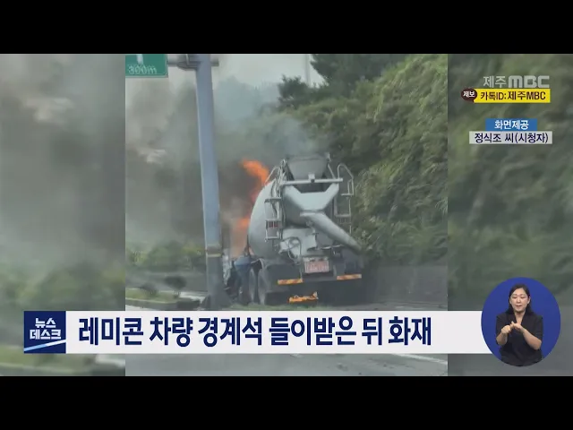 오늘 오후 5시 20분쯤 서귀포시 표선면 토산리의 한 도로에서 달리던 레미콘 차량이 도로 경계석을 들이받은 뒤 불이 났습니다. 사고 직후 운전자는 대피해 인명피해는 없었는데 경찰은 달리던 차량의 타이어가 펑크나면서 사고가 난 것으로 보고 정확한 사고경위를 조사하고 있습니다.