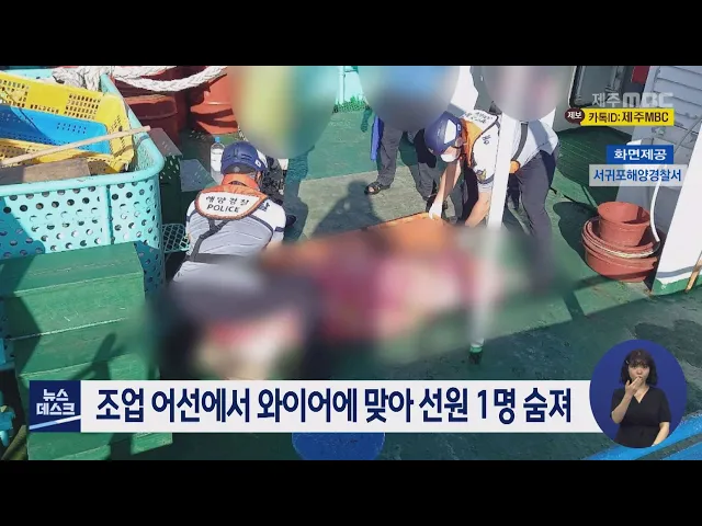 어제 아침 6시 45분쯤 서귀포시 남원읍 지귀도 동쪽 14km 해상에서 조업하던 129톤급 부산 선적 어선에서 60대 선원이 와이어로프에 맞아 병원으로 옮겨졌지만 숨졌습니다. 해경은 어선의 와이어를 감아 돌리는 기계가 떨어지면서 사고가 났다는 목격자의 진술에 따라 정확한 사고 경위를 조사하고 있습니다.