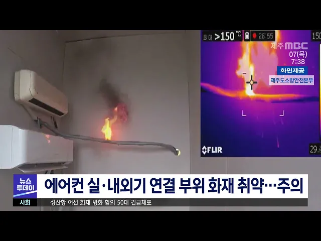 에어컨 실내기와 실외기 연결 부분이 화재에 취약한 것으로 나타났습니다. 제주 소방안전본부는 에어컨 실내기와 실외기 연결 부위가 발열과 화재에 취약하고, 올들어 제주에서 발생한 에어컨 화재 2건도 해당 부위가 원인으로 지목됐다고 밝혔습니다. 최근 5년 동안 전국에서 발생한 에어컨 화재는 천168건이며, 이 가운...