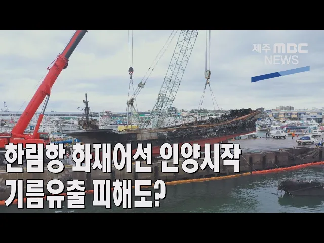 ◀ANC▶ 제주 한림항에서 발생한 어선 화재로 가라앉은 선체 인양이 시작됐습니다. 감식작업은 어선 3척을 모두 인양한 뒤에 이뤄질 예정인데, 사고 어선에서 흘러나온 것으로 추정되는 기름 피해 신고도 접수됐습니다. 이따끔 기자입니다. ◀END▶ ◀VCR▶ 까맣게 타버린 선체가 서서히 물 위로 떠오릅니다. 크레인 두...