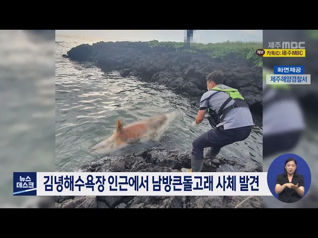 어제 오후 4시 20분쯤 제주시 김녕해수욕장 동쪽 갯바위 인근 해상에서 해양보호생물인 남방큰돌고래 사체가 발견됐습니다. 발견된 돌고래 사체는 길이 280센티미터에 150킬로그램으로 해경은 불법 포획 흔적이 없어 지자체에 인계했습니다. 올들어 제주해역에서는 남방큰돌고래 사체 두 마리가 발견됐습니다.
