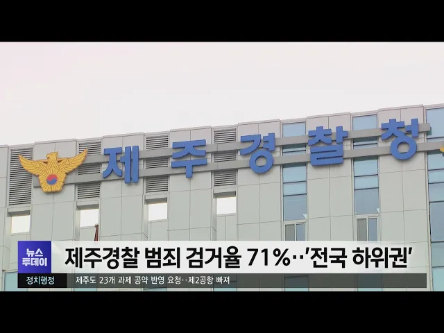 제주 경찰의 범죄 검거율이 전국에서 하위권에 머물렀습니다. 경찰청 통계에 따르면 올해 1분기 제주에서 발생한 범죄는 6천500여 건으로 이 가운데 4천600여 건만 범인을 잡아 검거율은 71%에 그쳤습니다. 전국 평균 범죄 검거율은 74%였으며 제주는 18개 시도 가운데 경기 남부청과 함께 공동 15위에 머물렀습니다.