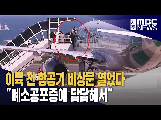 ◀ 앵 커 ▶ 이륙하려던 항공기 안에서 승객이 갑자기 비상문을 열어 항공기가 멈추는 사고가 제주공항에서 일어났습니다. 비상문을 연 30대 여성은 폐소공포증이 있는데, 답답해서 문을 열었다고 진술했습니다. 이따끔 기자가 보도합니다. ◀ 리포트 ▶ 계류장 한가운데 멈춰 선 항공기. 비상문이 열려 있고, 비상탈출용 슬라...
