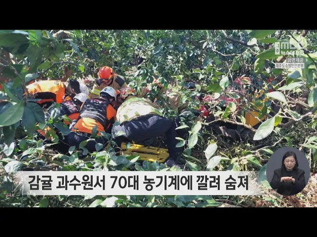감귤 과수원에서 일하던 70대가 농기계에 깔려 숨졌습니다. 오늘(14일) 오전 9시 반쯤 서귀포시 중문동의 한 감귤 과수원에서 70대 남성이 파쇄기에 깔려 병원으로 옮겨졌지만 숨졌습니다. 경찰과 소방당국은 이 남성이 가지치기를 하다가 사고를 당한 것으로 보고 정확한 사고 경위를 조사하고 있습니다. 한편, 최근 5년 ...
