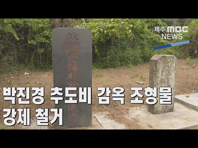 ◀ANC▶ 4.3 당시, 제주도민에 대한 무차별 진압을 주도하며 학살 주범으로 평가받는 박진경 대령 추도비에 설치됐던 감옥 형태의 조형물이 강제철거됐습니다. 시민사회단체들은 역사를 잊은 민족에게 미래는 없다며 반발했습니다. 이따끔 기자입니다. ◀END▶ ◀VCR▶ 제주 4.3 당시 강경 진압을 주도했던 박진경 대령...