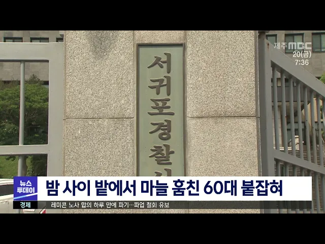 서귀포경찰서는 밤 사이 밭에서 마늘을 훔친 혐의로 60대 A씨를 불구속 입건했습니다. A씨는 그제(5/17) 밤 9시쯤 서귀포시 대정읍의 한 마늘밭 인근에서 말리고 있던 마늘 20킬로그램을 훔쳐 달아났다가, CCTV 등을 통해 추적한 경찰에 붙잡혔습니다.