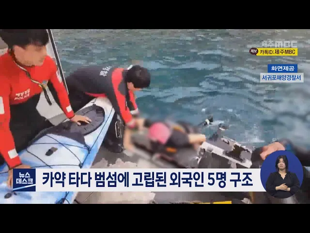 어제 오후 3시쯤 서귀포시 범섬에서 외국인 5명이 고립됐다는 신고가 해경에 접수됐습니다. 해경은 이들을 연안구조정으로 구조하고, 찰과상을 입은 1명은 구조대의 응급처치를 받았다고 밝혔습니다. 해경 조사 결과 이들은 카약 4대를 타고 서귀포시 법환포구에서 출발해 범섬으로 가다 1대가 파도에 뒤집혀 강풍과 거센 ...