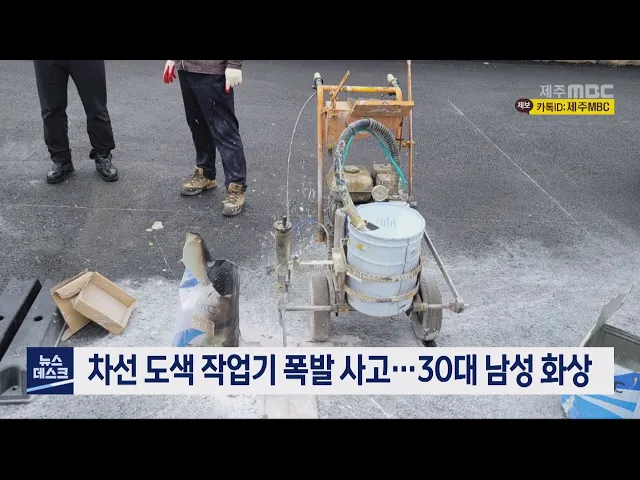 어제 오전 10시쯤 제주시 이도2동의 한 주차장에서 30대 남성 A씨가 차선 도색 작업을 하던 중 작업기가 폭발해 얼굴과 가슴에 화상을 입었습니다. 경찰과 소방당국은 A씨가 작업기 안에 있던 도료를 철제통에 붓는 과정에서 유증기가 폭발한 것으로 보고 정확한 사고경위를 조사하고 있습니다.