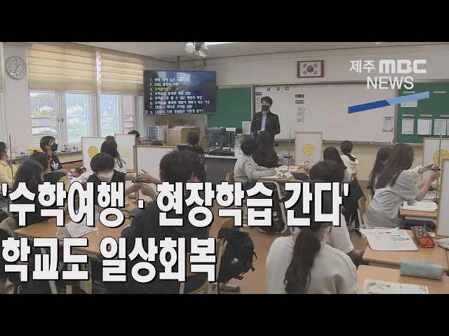 ◀ANC▶ 코로나19로 인한 사회적 거리두기가 전면 해제되면서, 학교에서도 일상회복이 추진됩니다. 전면 등교수업이 실시되고, 수학여행이나 현장 체험학습 제한도 해제됩니다. 이따끔 기자입니다. ◀END▶ ◀VCR▶ 점심시간 제주시내 한 초등학교. 학년 별로 시간 차 배식이 이뤄지고, 학생들은 정해진 자리에 앉아 식...