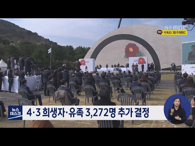 4.3 희생자와 유족 3천 272명이 추가로 결정됐습니다. 4.3 진상규명과 희생자 명예회복위원회는 지난해 상반기에 추가 신고된 3만 2천여 명 가운데 사실조사와 심의를 거쳐 희생자 38명과 유족 3천 234명을 결정했습니다. 이에 따라 제주4.3사건 희생자는 만 4천 577명, 유족은 8만 4천 340명으로 늘었습니다.
