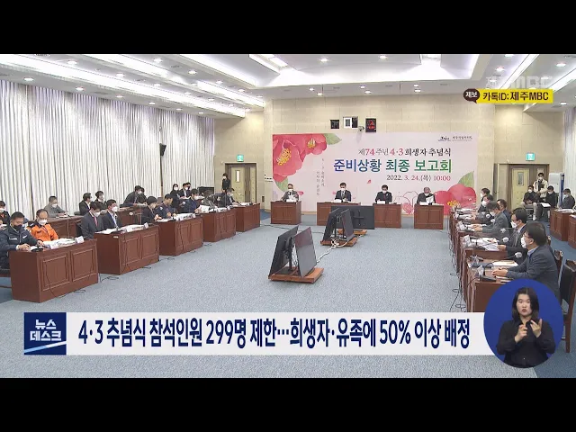 코로나19 확진자가 급증하면서 제 74주년 4.3 희생자 추념식이 축소돼 봉행됩니다. 제주도는 추념식 준비상황 보고회에서 방역을 위해 참석인원을 299명으로 제한하고 모든 참석자의 백신접종 완료 확인과 발열검사를 병행하며 현장 진료소도 운영하겠다고 밝혔습니다. 특히, 올해는 참석자의 절반 이상을 4.3 생존희생자...