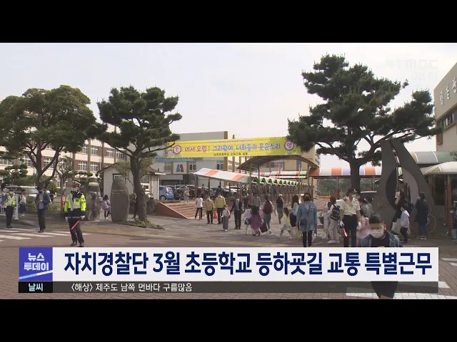 제주도 자치경찰단은 새학기 전면 등교수업 시행에 따라 이달 한달 동안 초등학교 주변 보행안전을 위한 등·하굣길 교통 특별근무에 나섭니다. 자치경찰단은 도심 지역인 한라초, 오라초, 아라초 등 8개교에서 등교시간에는 통학로에 교통경찰관이 근무하고 하교시간에는 어린이 통학버스 법규위반을 단속합니다.