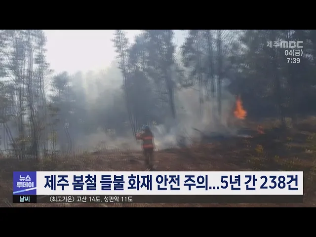 제주지역에서 발생한 들불의 절반 가까이가 봄철에 발생한 것으로 나타났습니다. 제주소방안전본부에 따르면 최근 5년 동안 발생한 들불 238건 가운데 45%인 238건이 3월에서 5월 사이에 발생했습니다. 화재원인은 쓰레기 소각과 담배꽁초 등 부주의가 87% 발생장소는 과수원이 66%로 가장 많았습니다.