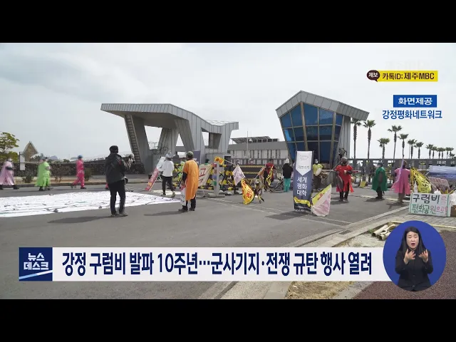 강정해군기지 반대주민회와 강정평화네트워크는 해군기지 건설로 인한 구럼비 발파 10주년을 맞아 제주해군기지 인근에서 풍물놀이와 인간띠 잇기 등 문화제 행사를 진행했습니다. 이들은 10년 전 오늘, 서귀포 강정 해안의 구럼비 바위와 함께 생명과 평화가 부서졌다며, 군사기지와 전쟁 없는 세상을 위해 빼앗긴 강정마...