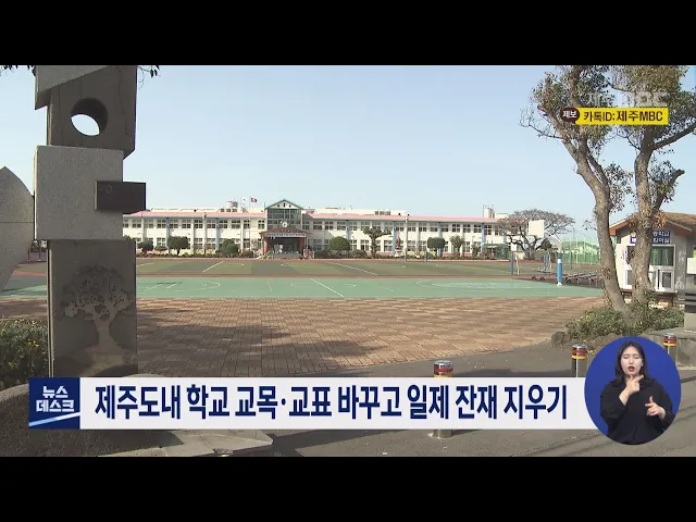 도내 학교들이 일제 식민지 잔재 지우기에 나섰습니다. 제주도교육청에 따르면 도내 학교 13곳이 교목을 가이즈카 향나무에서 우리나라 고유 수종으로 교체했고 2곳은 영산홍 등 교화를 다른 종으로 바꿨습니다. 욱일기나 월계수 잎 문양 등의 교표와 교기를 바꾼 곳은 13곳이었고 4곳은 교훈을 2곳은 교가를 바꿨습니다.