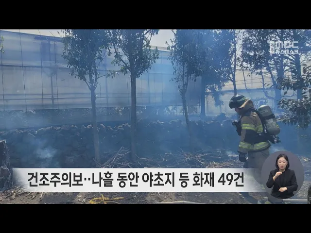 제주 북부와 동부, 산지에 건주주의보가 내려진 가운데 화재가 잇따르고 있습니다. 어제 오전 11시 반쯤 제주시 봉개동의 한 과수원에서 불이 나 비닐하우스 130제곱미터와 나무 45그루를 태웠습니다. 이보다 앞선 아침 9시쯤에는 제주시 월평동에서 소각 부주의로 불이 나 삼나무와 소나무 등 47그루가 불에 탔습니다. 제...