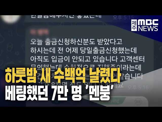 ◀ 앵 커 ▶ 제주MBC는 제주에서 유행처럼 번지고 있는 스포츠 역베팅 게임의 위험성을 연속 보도해 드렸는데요. 하룻밤 새 7만 명이 넘는 회원들이 수백억 원이 넘는 베팅 금액을 한꺼번에 날리는 일이 벌어졌습니다. 경찰도 수사에 착수했습니다. 이따끔 기자가 보도합니다. ◀ 리포트 ▶ 축구 경기 베팅이 이뤄지는 한 온라...
