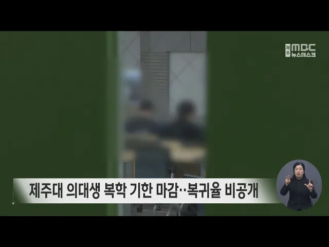 제주대학교 의대생 복학 기한이 어제 마감됐지만 복귀 현황은 공개되지 않았습니다. 제주대 의대생 310명 가운데 1학년을 제외한 225명은 휴학 상태인데, 학교 측은 구체적인 학생 복귀 현황은 공개할 수 없다고 밝혔습니다. 제주대 측은 교육부가 전국 의대생 복학 마감 기한인 이달 31일 이후 복귀율을 취합해 관련 방침...