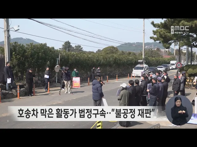 국가보안법 위반 혐의로 구속된 피의자가 탄 호송차를 막고 경찰을 밀친 활동가 2명이 항소심에서 법정 구속됐습니다. 제주지방법원 형사1부는 재작년 3월, 제주교도소 앞에서 공안탄압 규탄 기자회견을 마친 뒤 호송차를 막고 경찰관을 밀친 혐의로 1심에서 집행유예를 받은 2명에 대해 징역 1년 8개월을 선고하고 법정구...