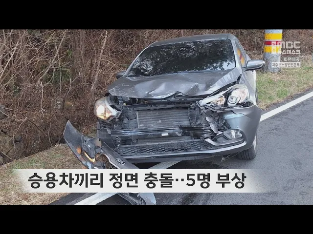 승용차끼리 정면 충돌해 운전자 등 5명이 다쳤습니다. 오늘 오후 5시 20분쯤 서귀포시 안덕면 광평리 산록도로에서 승용차 2대가 충돌해 운전자와 탑승객 등 5명이 다쳐 병원으로 옮겨졌습니다. 경찰은 차량 블랙박스와 운전자들의 말을 바탕으로 정확한 사고 경위를 조사하고 있습니다.