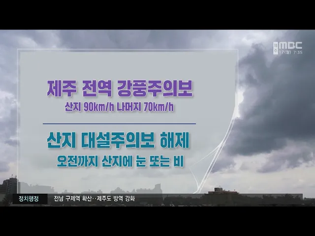 다음은 날씨 소식입니다. 강한 바람이 불면서 추운 날씨가 이어지고 있습니다. [ CG ] 제주 전역에는 강풍주의보가 내려졌습니다. 오늘 늦은 오후까지 산지에는 바람이 순간풍속 시속 90㎞, 나머지 지역에도 시속 70㎞ 이상으로 강하게 불겠습니다. [ CG ] 밤사이 산지에 내려졌던 대설주의보는 해제된 가운데, 오전...