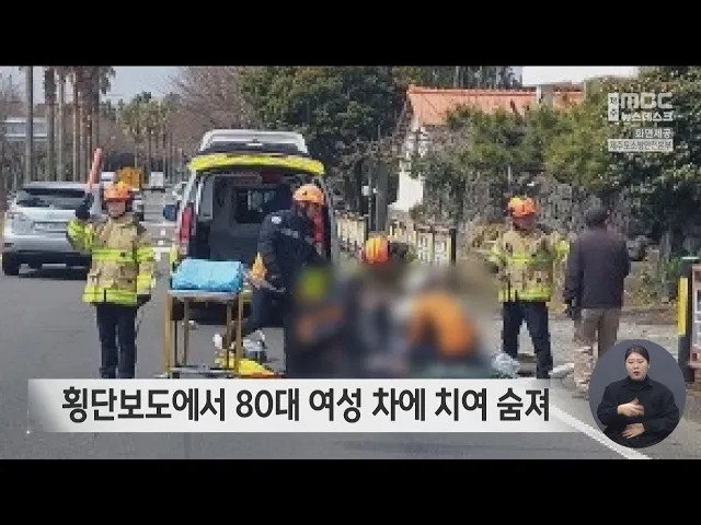 횡단보도를 건너던 80대 여성이 차에 치여 숨졌습니다. 오늘 오전 11시 40분쯤 서귀포시 회수동 회전교차로 횡단보도에서 80대 여성이 승합차에 치여 병원으로 옮겨졌지만 숨졌습니다. 경찰은 승합차 운전자인 60대 남성을 교통사고처리특례법 위반 치사 혐의로 입건해 정확한 사고 경위를 조사하고 있습니다.