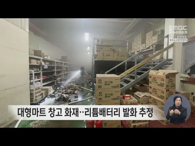 오늘 새벽 3시 50분쯤 제주시 애월읍 하귀리에서 대형마트 창고에 불이 났습니다. 화재 경보를 듣고 출동한 보안 직원이 119에 신고해 불은 20분 만에 진화됐으며, 인명피해는 없었지만 창고 벽면 일부와 식료품 등이 불에 탔습니다. 소방당국은 창고에 보관 중인 리튬 배터리에서 불이 시작된 것으로 보고 정확한 화재 원...