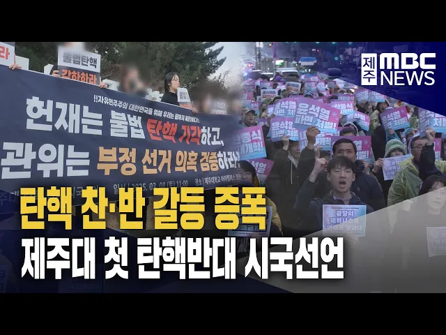◀ 앵 커 ▶ 윤석열 대통령이 석방되면서 제주에서도 탄핵 찬반을 둘러싼 갈등이 증폭되고 있습니다. 제주대에서 처음으로 탄핵 반대 시국선언이 이뤄졌고 광장에서는 대통령 석방을 규탄하고 탄핵을 촉구하는 집회가 열렸습니다. 이따끔 기자가 보도합니다. ◀ 리포트 ▶ 주말 아침부터 피켓과 태극기를 든 시민들이 모였...