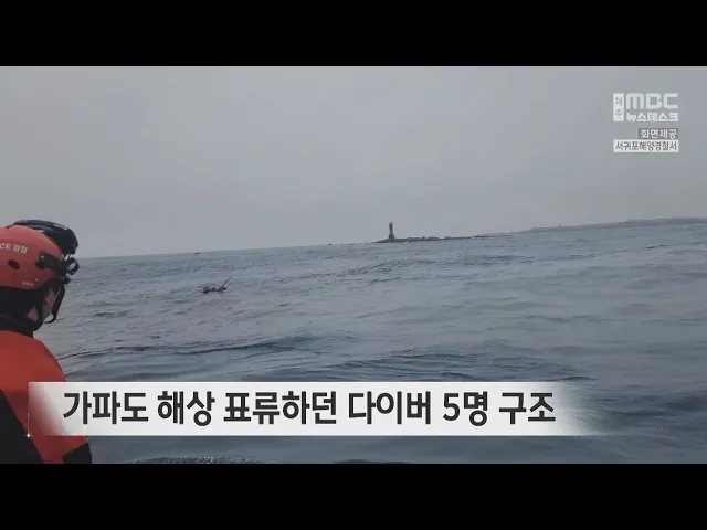 가파도 해상에서 표류하던 다이버 5명이 구조됐습니다. 어제(1일) 오후 4시쯤 가파도 북동쪽 1.8㎞ 해상에서 다이버 5명이 표류하다 30여 분 만에 해경에 구조됐습니다. 이들은 건강에 이상이 없어 귀가 조치됐는데, 다이빙을 하다 출수했지만 선박을 발견하지 못해 표류했던 것으로 확인됐습니다.