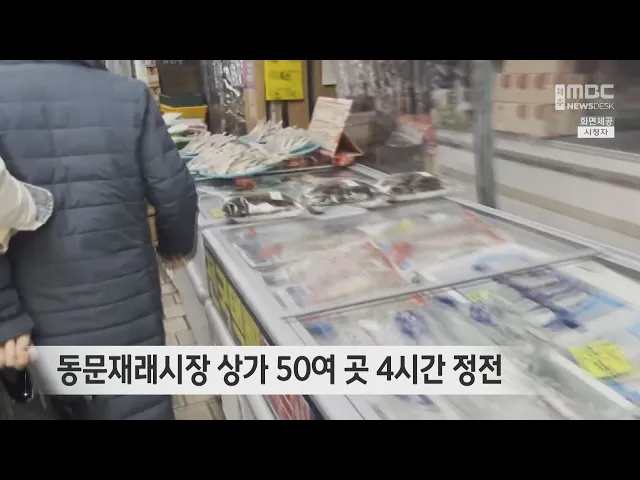 동문재래시장에서 정전 사고가 발생해 상인들이 큰 불편을 겪었습니다. 오늘 낮 12시 10분쯤 제주시 동문재래시장에서 수산물 가게 등 50여 개 상가에 전기 공급이 갑자기 끊겼습니다. 한전은 전력 복구팀을 보내 4시간 만에 전기 공급을 재개했는데, 시장 내 변압기 고장을 원인으로 추정하고 정확한 사고 원인을 조사하고...