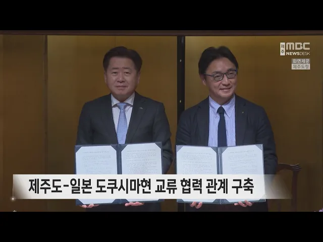 제주도가 일본 도쿠시마현과 교류 협력을 위한 양해각서를 체결했습니다. 오영훈 제주도지사는 어제 일본 도쿠시마현에서 고토다 마사즈미 도쿠시마현지사를 만나 수소 생태계 구축과 재생에너지 확대, 농업 기술을 교류하고 제주와 도쿠시마현을 잇는 전세기 항공노선 개설을 추진하기로 했습니다. 일본 시코쿠 동부에 있...