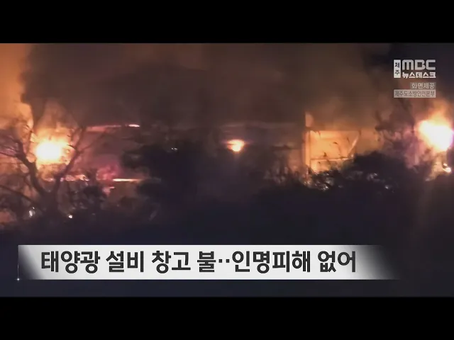 어젯(1일)밤 10시 반쯤 제주시 애월읍에서 태양광 설비 자재 보관 창고에 불이 났습니다. 이 불로 다친 사람은 없었지만 창고 198㎡와 안에 있던 태양광 기기 등이 불에 타 소방서 추산 3천800만 원의 재산피해가 났습니다. 경찰과 소방당국은 화재 원인을 조사하고 있습니다.