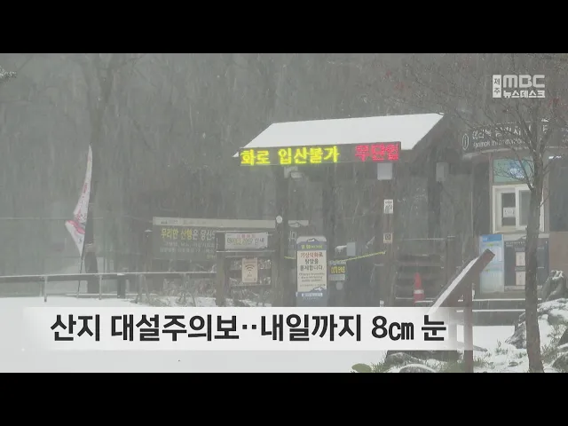 오늘 제주 지역은 흐린 가운데 산지에 눈이 내려 쌓이고, 해안지역에는 비가 오고 있습니다. 대설주의보가 내려진 산지에는 한라산 남벽 5.7cm, 사제비 동산에 5.5cm, 영실에 3.6cm가 넘는 눈이 내려 쌓였습니다. 기상청은 내일까지 산지에 최대 8cm의 눈이 쌓이고, 해안에는 10mm 내외의 비가 내릴 것으로 예보했습니다...