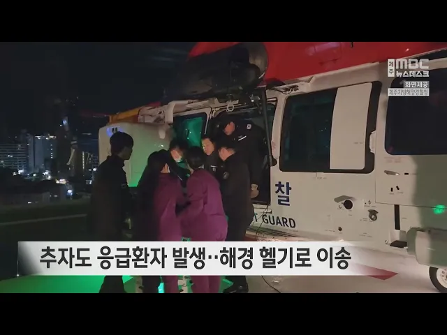 추자도에서 발생한 응급 환자가 헬기로 긴급 이송됐습니다. 제주지방해양경찰청은 어제 오후 6시 40분쯤 추자도에서 80대 여성이 의식을 잃어가고 있다는 신고를 받고 헬기를 보내 도내 병원으로 옮겼습니다. 이송된 환자는 종합병원 중환자실에서 치료받고 있습니다.