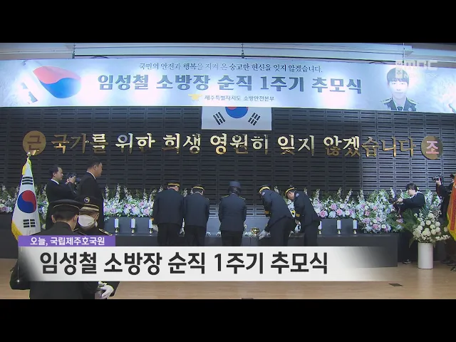 지난해 창고 화재 진압 중 순직한 임성철 소방장의 1주기 추모식이 국립제주호국원에서 열렸습니다. 추모식에는 유가족과 동료 소방관 등 150여 명이 참석해 헌화와 분향을 하며 고인을 추모했습니다. 또 올해 소방공무원 시험에 합격한 고인의 형 임지혁 씨도 참석해 "멋진 소방관으로서 책임감 있게 일해 부끄럽지 않은 ...