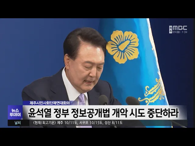 제주시민사회단체연대회의가 윤석열 정부는 시민 알권리를 침해하는 정보공개법 개악 시도를 중단하라고 촉구했습니다. 이들은 성명를 통해 윤석열 정부가 제출한 개정안은 공공기관이 자의적인 법 해석으로 국민의 알권리를 부당하게 제한할 가능성이 크다고 비판하고 즉각 철회하라고 요구헀습니다. 정부는 지난 10월 ...