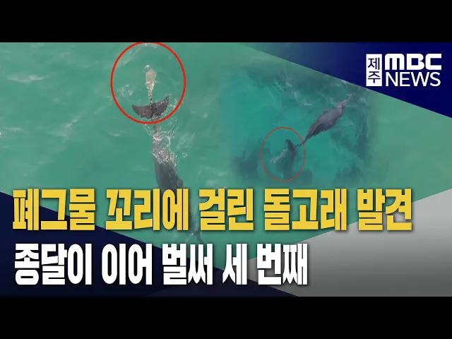 ◀ 앵 커 ▶ 온 몸이 낚싯줄에 감겨 죽을 위기에 처한 새끼 남방큰돌고래가 발견돼 구조 작업까지 벌인 소식 전해드렸는데요. 근처에서 이번에는 꼬리에 그물이 감긴 또다른 남방큰돌고래가 발견됐습니다. 이따끔 기자가 보도합니다. ◀ 리포트 ▶ 광어 한마리를 물고 물 위로 올라온 남방큰돌고래 한 마리. 자세히 보니 꼬리 ...