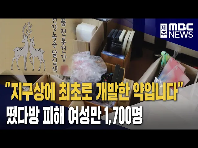 ◀ 앵 커 ▶ 건강식품을 만병통치약인 것처럼 속여 팔아 온 이른바 '떴다방' 일당이 제주에서 또 적발됐습니다. 납품업자까지 끌어들여 수입산 녹용으로 한약까지 만들어 100만 원에 팔았는데, 피해자들만 천700명이 넘습니다. 이따끔 기자가 보도합니다. ◀ 리포트 ▶ 강의실로 보이는 방 안에서 한 남성이 장난을 섞어가며 무...