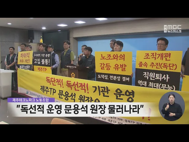 제주테크노파크 노동조합 조합원들이 원장의 독선적 운영을 비판하며 사퇴를 촉구했습니다. 공공과학기술연구노동조합 테크노파크본부는 제주도의회에서 기자회견을 열고 문 원장이 업무추진비를 부정하게 사용하고, 전문성이 없는 사람을 윤리경영실장으로 임명해 부당한 중징계를 남발하게 하는 등 인사권과 경영권을 마...