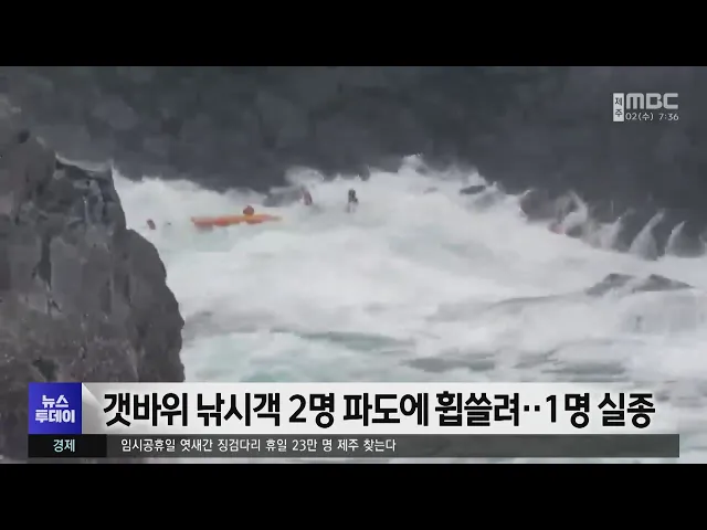 갯바위 낚시객들이 파도에 휩쓸려 한 명이 실종됐습니다.어제(1일) 오후 5시 10분쯤서귀포시 황우지해안 선녀탕 주변 갯바위에서 낚시를 하던 50대 남성 두 명이 파도에 휩쓸렸습니다. 이 가운데 한 명은 스스로 물 밖으로 나왔지만,다른 한 명은 바다에 빠진 뒤 실종돼 해경이 경비함정과 구조대를 동원해수색을 벌이고 있...