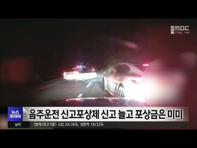음주운전 신고포상제 부활 이후 신고는 늘었지만 포상금 신청은 미미한 것으로 나타났습니다.제주경찰청에 따르면 신고포상제가 본격 시행된 올해 1월부터 지난달까지 들어온 음주운전 신고는 4천여 건으로,하루 평균 17건에 달했습니다.의심 신고 중 8건에 1건은실제 음주운전으로 확인됐습니다. 하지만 신고자가 포상금을...