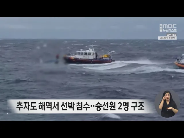 오늘 오후 3시 50분쯤 추자도 횡간도 북동쪽 11km 해상에서 0.9톤급 양식장관리선이 침수됐지만 다행히 인명피해는 발생하지 않았습니다. 제주해양경찰서는 완도 해경과 함께 추자도 우두도 북쪽 9km에서 사고 발생 1시간 만에 선박을 발견해 승선원 2명을 모두 안전하게 구조했다고 밝혔습니다. 해경은 사고 선박이 횡...