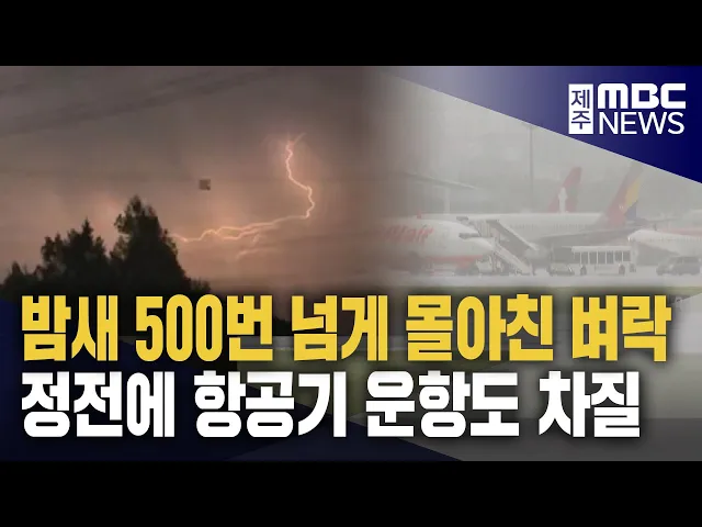 ◀ 앵 커 ▶ 어젯밤 제주에서는 밤새 계속된 벼락으로 시민들이 잠못드는 밤을 보냈습니다. 500차례 넘는 벼락이 관측됐는데 항공기 운항이 차질을 빚기도 했습니다. 이따끔 기자가 보도합니다. ◀ 리포트 ▶ 한밤중 깜깜한 하늘이 번쩍하며 붉게 변하더니, 하늘에 지진이 난듯 번개가 칩니다. 무언가 폭발하는듯 계속해서...