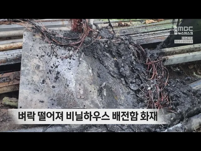 주말 사이 제주 지역에 대기불안정이 이어지면 벼락에 의한 화재 피해도 발생했습니다. 어제(17일) 오전 11시 40분쯤 서귀포시 안덕면 상창리 한 비닐하우스 배전함에 벼락이 떨어져, 배전함 한 대와 비닐하우스 6제곱미터를 태웠습니다. 소방당국은 정확한 화재 원인을 조사하고 있습니다.