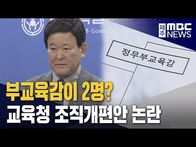 ◀ 앵 커 ▶ 제주도교육청이 부교육감을 한 명 더 늘리는 내용의 조직개편안을 입법 예고했습니다. 교육현장의 목소리와는 동떨어진 정치적 개편이라는 비판도 나오고 있어 도의회 결정에 관심이 모아지고 있습니다. 이따끔 기자가 보도합니다. ◀ 리포트 ▶ 김광수 교육감 취임 이후 3번째로 추진하고 있는 조직개편. 기...