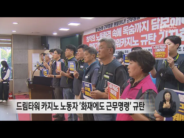 제주 드림타워 카지노 노동자들이 최근 드림타워에서 발생했던 화재에도 근무를 명령한 책임자를 엄벌하라고 촉구했습니다. 이들은 오늘 오전 제주도의회에서 기자회견을 열고 지난 9일 드림타워 사우나에서 화재가 발생했을 때 카지노 노동자들은 대피 안내를 받지 못한 채 업무명령을 받아 근무하고 있었다며 회사의 대...