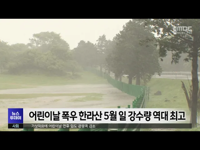어린이날 내린 폭우로 한라산의 5월 일일 강수량이 역대 최고치를 기록했습니다. 제주지방기상청에 따르면 어린이날인 지난 5일 하루 동안 한라산 진달래밭에 936㎜의 비가 내려 5월 하루 강수량으로는 역대 가장 많았습니다. 이전 최고치였던 2013년 5월 27일 일 강수량 718㎜와 비교해 200㎜ 이상 더 많이 내렸는데, 이날...